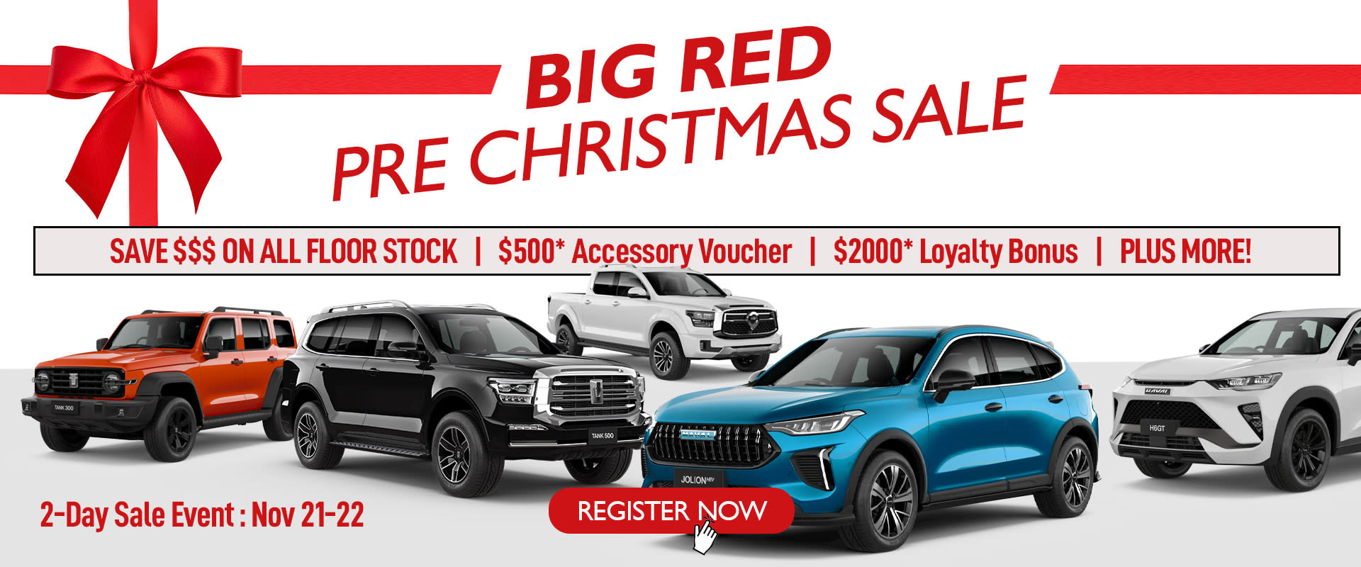 Terms & Conditions: The Big Red Sale runs from 8:30 AM Friday, November 21st to 5:30 PM Saturday, November 22nd, 2025, with all offers valid only during this period. Offers apply to new and demonstrator GWM models (Cannon, Tank 300, Tank 500, Haval Jolion, Haval H6, and H6 GT) and cannot be combined with other promotions or previous purchases. A $2,000 loyalty bonus applies to verified returning customers only, and a $500 accessory voucher can be used towards aftermarket or genuine accessories. Stock is limited and available on a first-come, first-served basis. Free gifts are included with every purchase while supplies last and are not redeemable for cash. Vehicles must be purchased during the event and delivered before November 30, 2025, to qualify. Tweed Coast GWM reserves the right to modify or cancel the event without notice.