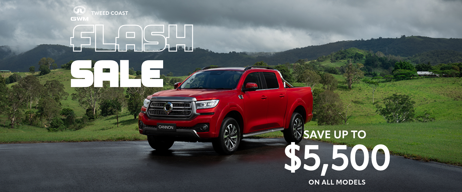 *Terms & Conditions: Feb Flash Sale is open to all customers. The sale runs on February 22nd, 9:00 AM - 5:30 PM, with all offers valid only during this period. Discounts apply to new or demo models, including Cannon, Jolion, H6, Tank, Ora and cannot be combined with other promotions or past purchases. Inventory is subject to availability, and demonstrator models are sold on a first-come, first-served basis. Free trade appraisals and test drives are available during the event, with test drives limited to short trips around the block. GWM is under no obligation to make an offer or to purchase the vehicle or any other vehicle, and reserves the right not to make an offer or to purchase the vehicle or any other vehicle at its discretion and without explanation, applicable to the final purchase price. Complimentary gifts are available while supplies last and cannot be exchanged for cash. Tweed Coast GWM reserves the right to cancel or modify the sale event without prior notice, and all sales are final. By participating, customers agree to these terms. For questions, contact us at 07 5506 9000.